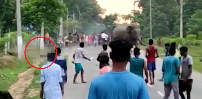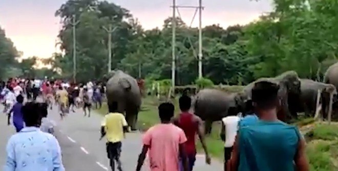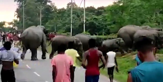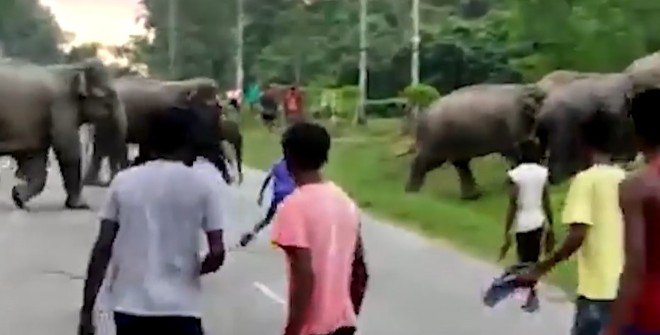 As imagens chocantes foram registradas no nordeste da Índia, no estado de Assam. Elefantes em busca de comida passaram por uma estrada e interromperam o fluxo de trânsito, ocupado principalmente por agricultores de uma plantação de chá