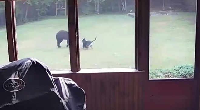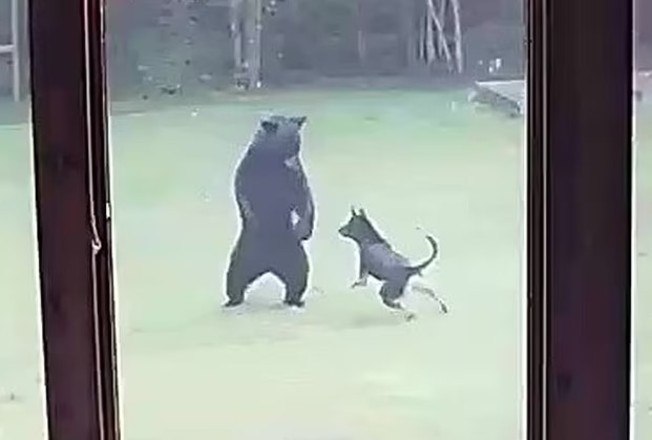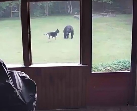 Um pastor alemão foi flagrado brincando com um urso selvagem como se fossem velhos amigos. O vídeo com o momento descontraído incomum foi registrado em Vermont (EUA), no dia 30