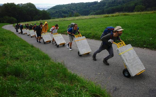 Essa fila de pessoas que parecem entregadores atrasados com encomendas, na verdade é uma performance artística. Na obra, voluntários movem placas de arenito de 100 kg por uma estrada perto de Spreitenbach, Suíça