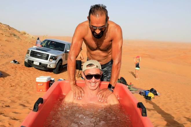 A felicidade está estampada no rosto desse sujeito que resolveu participar de uma sessão de terapia de banho de gelo no deserto perto de Sharjah, Emirados Árabes Unidos
