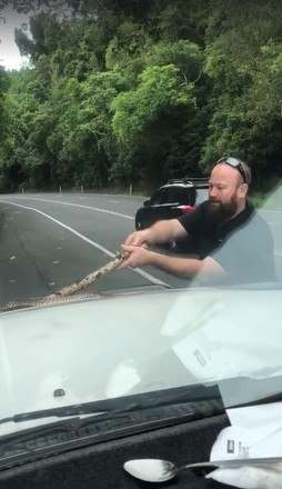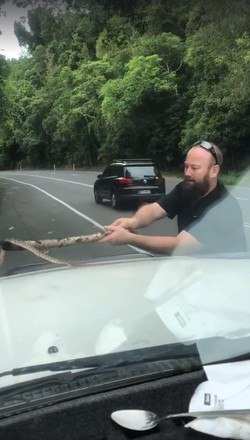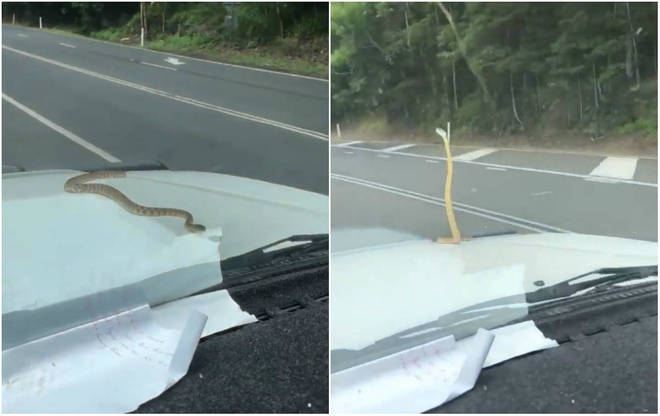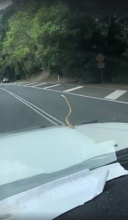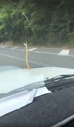 Uma cobra-arbórea-marrom pegou carona no carro de uma família que voltava de uma viagem de acampamento. O réptil "surfou" no capô do veículo e deu um susto nos humanos