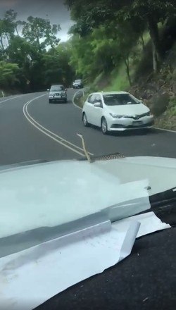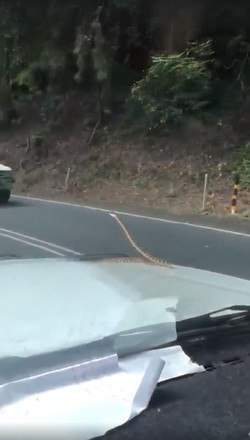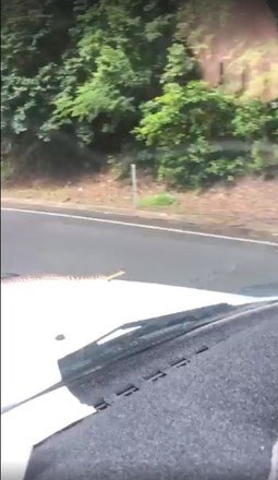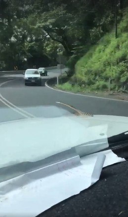 A cobra, provavelmente caída de uma das árvores que cercam a estrada, começou a se equilibrar no capô do veículo