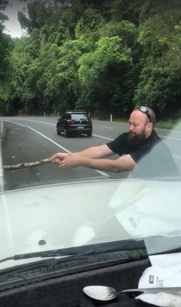 Sem um acostamento apropriado, a família foi obrigada a seguir o caminho com o réptil obstruindo a visão