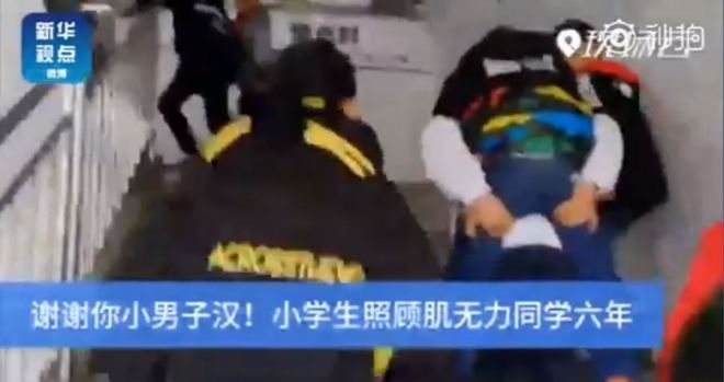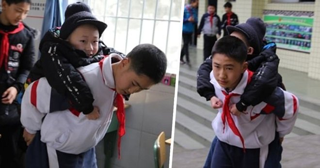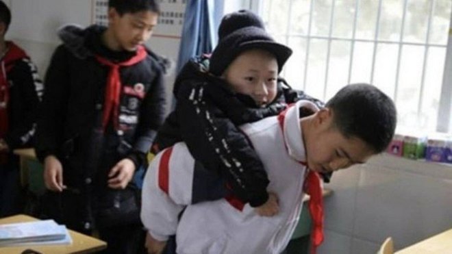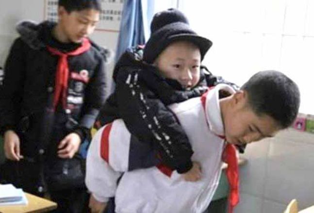 Há seis anos um estudante chinês carrega seu amigo nas costas para levá-lo à escola, todos os dias, faça chuva ou faça sol. Xu Bingyang e Zhang Ze, de 12 anos, moram na província de Sichuan (sul da China) e são inseparáveis. Além do trajeto, ele o leva ao banheiro, ajuda a pegar água e buscar o almoço. A bonita amizade ganhou manchetes internacionais após ser noticiada pela mídia local