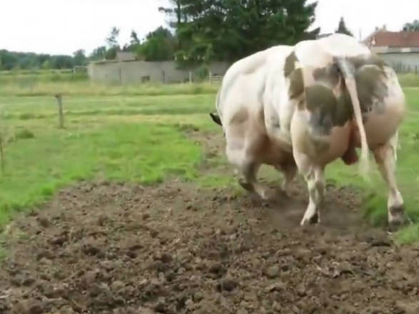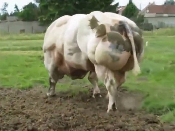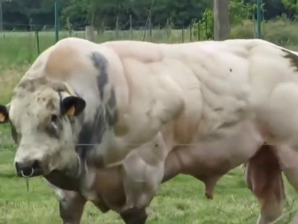 O touro acima possui o dobro de músculos de um bovino normal. Segundo o tabloide britânico Daily Star, o animal pertence à raça Belga Azul