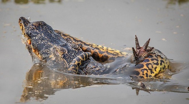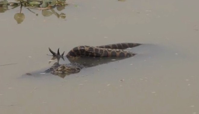 No entanto, o jacaré ainda conseguiu revidar, mordendo e cravando os dentes no pescoço da cobra assassina