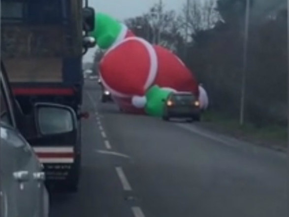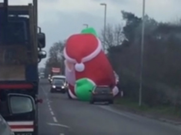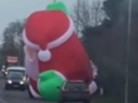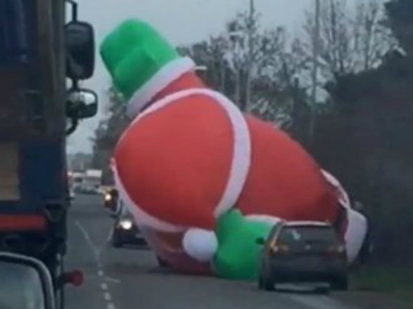 O Papai Noel inflável acima "se libertou" das amarras que o mantinham preso a um jardim e promoveu o caos na Estrada Cromwell, em Wisbech, na Inglaterra. As informações são do tabloide britânico Metro News