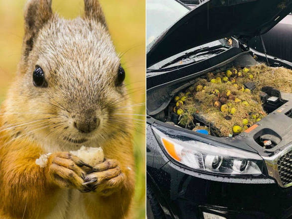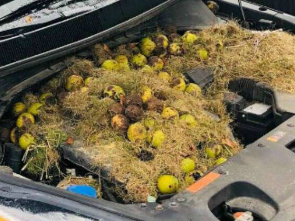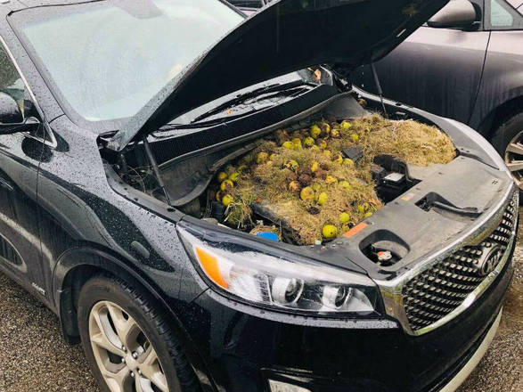 Mais de 200 nozes e tufos de grama haviam sido armazenados no motor do carro