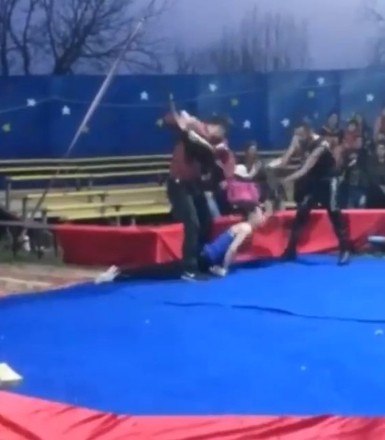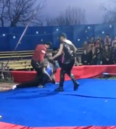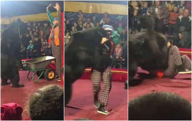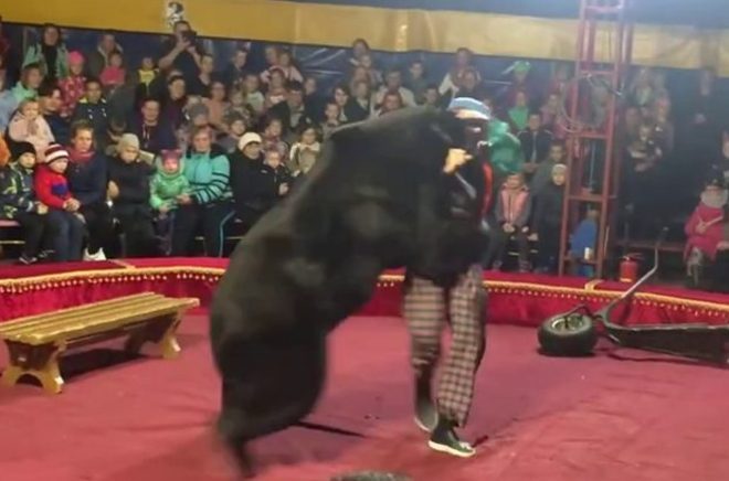 Os artistas agridem o urso, mas não conseguem separá-lo do treinador, que continua a ser atacado