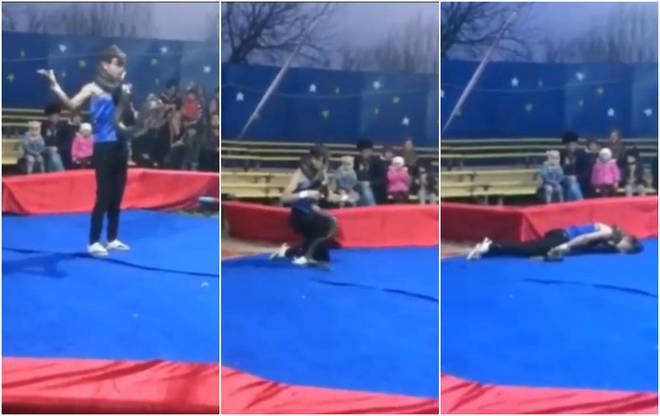 O artista continua sem se movimentar enquanto seus colegas o levam para os bastidores. A polícia de Dagestan nega que o incidente tenha acontecido na região