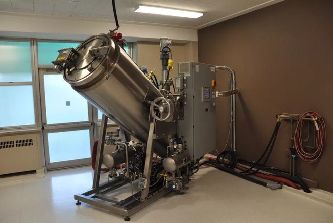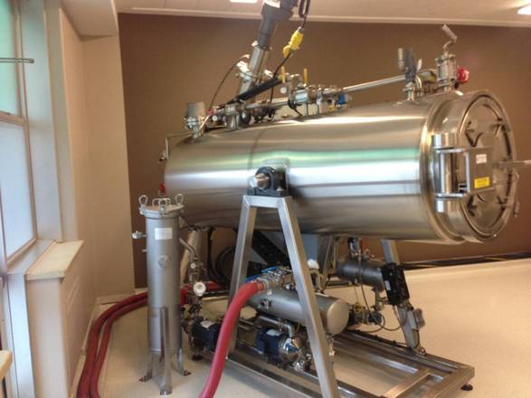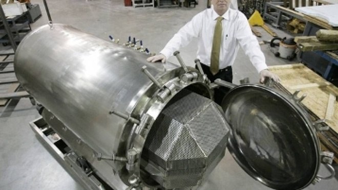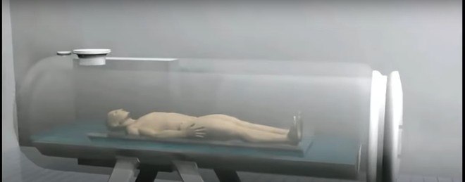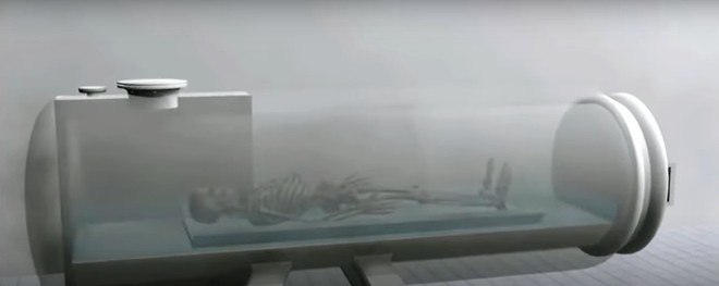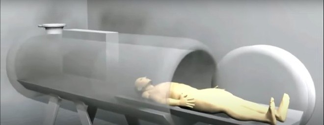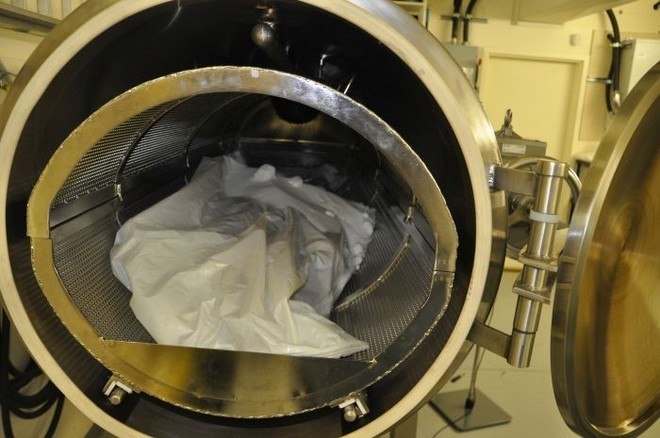 O corpo é colocado numa câmera e submetido a pressão, calor e uma solução de hidróxido de potássio ou hidróxido de sódio