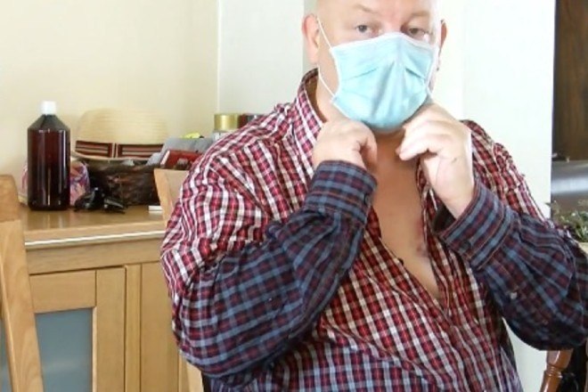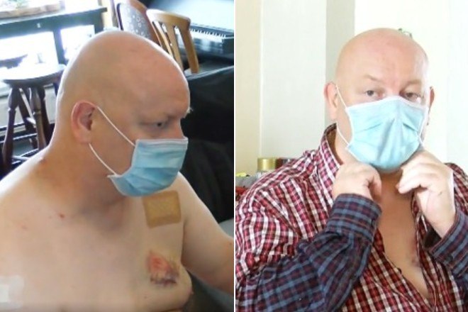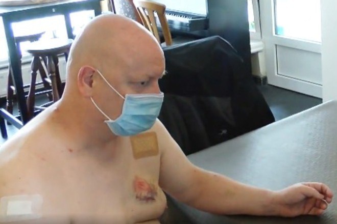 O homem acima afirma ter levado duas mordidas no peito em um ônibus, após tentar corrigir um dos passageiros sobre como usar a máscara contra o novo coronavírus