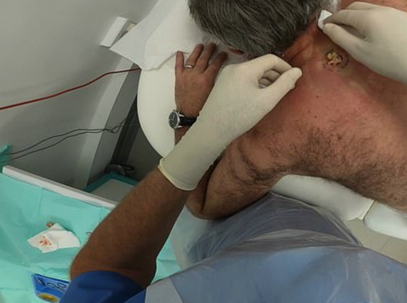 O paciente tomou anestesia local, e foi necessário fazer uma pequena incisão antes de espremer o cisto